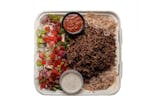 Choice of two sides with haifa sauce and dill sauce topped off with falafel.
